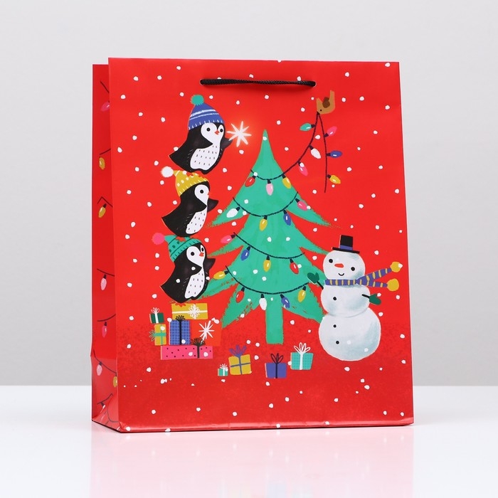 Пакет подарочный "Пингвины на ёлке", 26 х 32 х 12 см