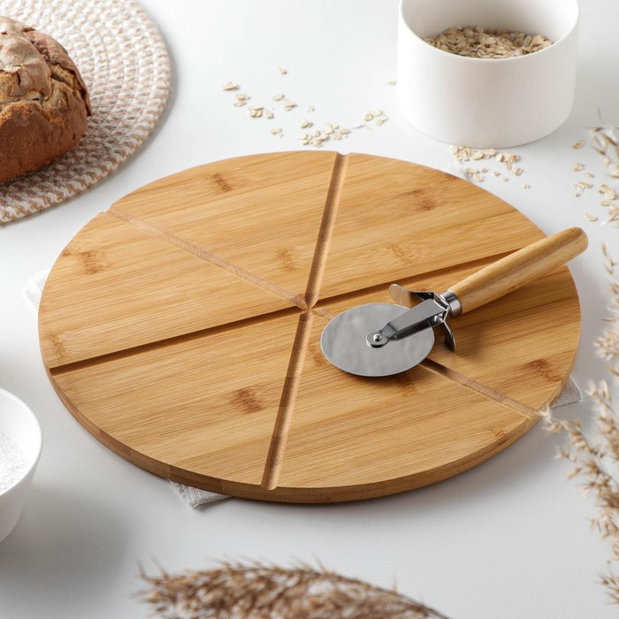 Доска для подачи пиццы Доляна, d=32 см, в комплекте с ножом, бамбук, нержавеющая сталь