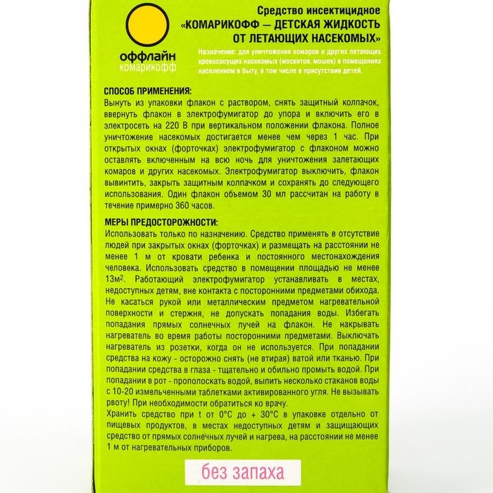 Назначение: для уничтожения комаров и других летающих кровососущих насекомых (москитов, мошек) в помещениях населением в быту, в том числе в присутствии детей.Способы применения: вынуть из упаковки флакон с раствором, снять защитный колпачок, ввернуть флакон в электрофумигатор до упора и включить его в электросеть на 220 В при вертикальном положении флакона. Полное уничтожение насекомых достигается менее чем через 1 час. При открытых окнах (форточках) электрофумигатор с флаконом можно оставлять включенным на всю ночь для уничтожения залетающих комаров и других насекомых. Электрофумигатор выключить, флакон вывинтить, закрыть защитным колпачком и сохранять до следующего использования. Один флакон объемом 30 мл рассчитан на работу в течение примерно 360 часов.Меры предосторожности: использовать только по назначению. Средство применять в отсутствие людей при закрытых окнах (форточках) и размещать на расстоянии не менее 1 м от кровати ребенка и постоянного местонахождения человека. Использовать средство в помещении площадью не менее 13м2. Работающий электрофумигатор устанавливать в местах, недоступных детям, вне контакта с посторонними предметами обихода. Не касаться рукой или металлическим предметом нагревательной поверхности и стержня, не допускать попадания воды. Избегать попадания прямых солнечных лучей на флакон. Не накрывать нагреватель во время работы посторонними предметами. Выключать нагреватель из розетки, когда он не используется. При попадании средства на кожу - осторожно снять (не втирая) ватой или тканью. При попадании средства в глаза - тщательно и обильно промыть водой. При попадании в рот - прополоскать водой, выпить несколько стаканов воды с 10-20 измельченными таблетками активированного угля. При необходимости обратиться ко врачу. Хранить средство при t от 0°С до + 30°С в упаковке отдельно от пищевых продуктов, в местах недоступных детям и защищающих средство от прямых солнечных лучей и нагрева, на расстоянии не менее 1 м от нагревательных приборов.защищает бережно с натуральным экстрактом ромашки.Состав: натуральные пиретрины (0,025%), трансфлутрин (0,1%), праллетрин (0,5%), растворитель.Класс опасности: 4 (малоопасное вещество).Объём: 30 мл.