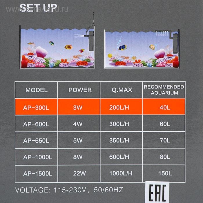 Фильтр внутренний Hidom AP-300 L, 200л/ч, до 40 литров, с регулятором и дождиком