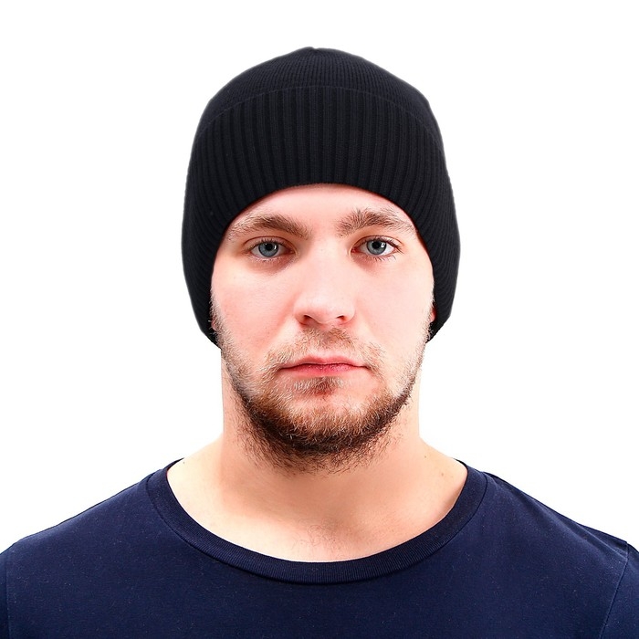 Шапка вязаная, с отворотом, на флисе, мелкий рубчик, чёрная