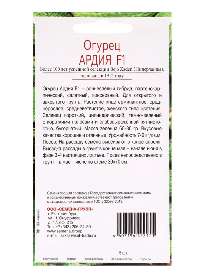 Семена Огурец Ардия F1, «Всхожесть 100%», 5 шт.