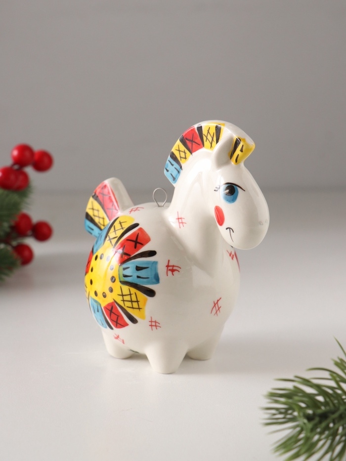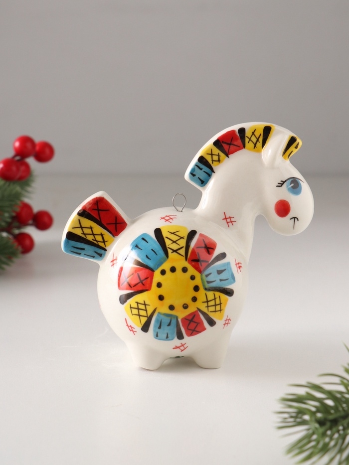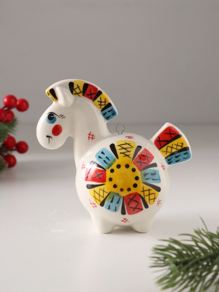 Ёлочный фарфоровый шар "Лошадь Солнце Лоскутное" /авторская роспись/, 11 см