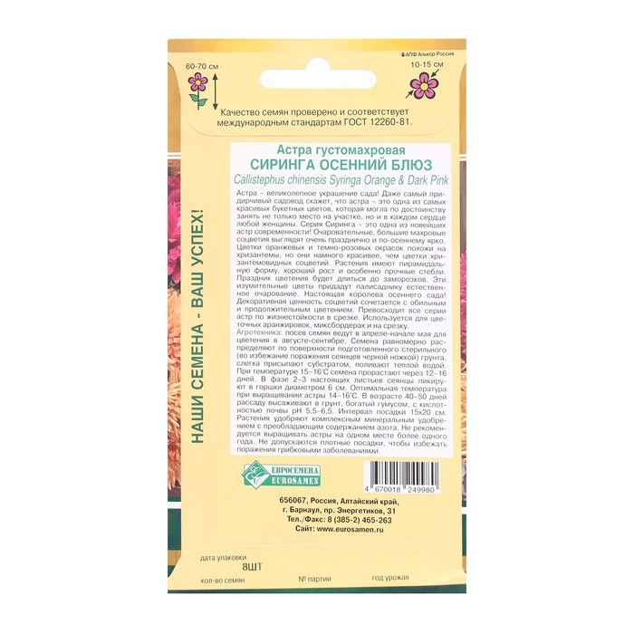 Семена Цветов Астра густомахровая Сиринга Осенний Блюз, 8 шт