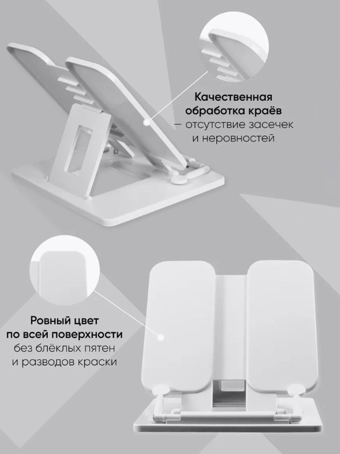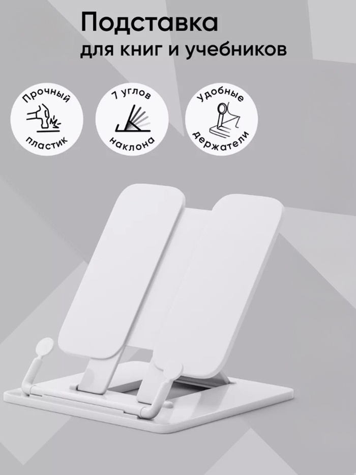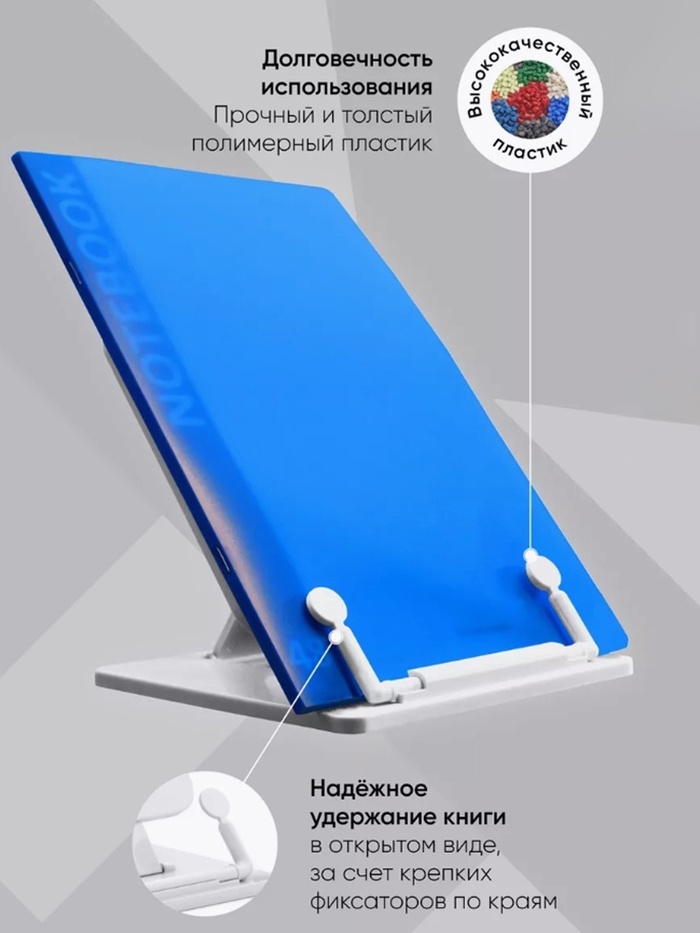 Пластиковая складная подставка с фиксатором. Семь углов наклона для расположения книги, что положительно влияет на осанку и зрение ребенка. Наличие держателей для надёжной фиксации страниц и может использоваться как закладка, а также двух по краям для пишущих принадлежностей. Ширина подставки — 235 мм, высота спинки — 190 мм.