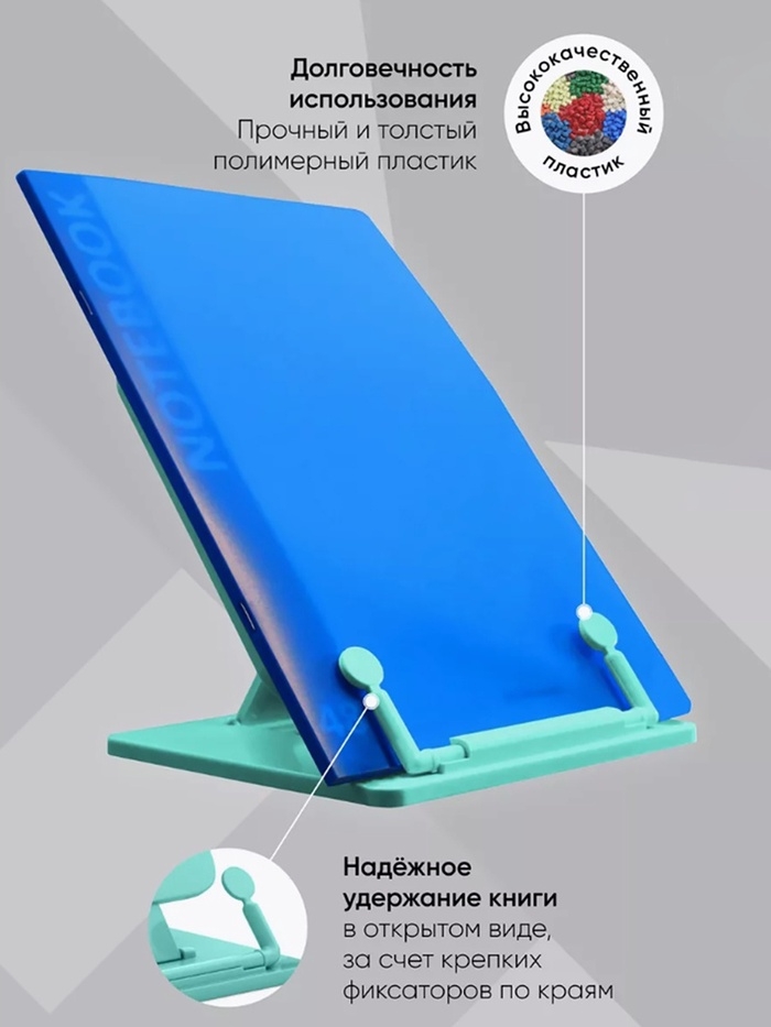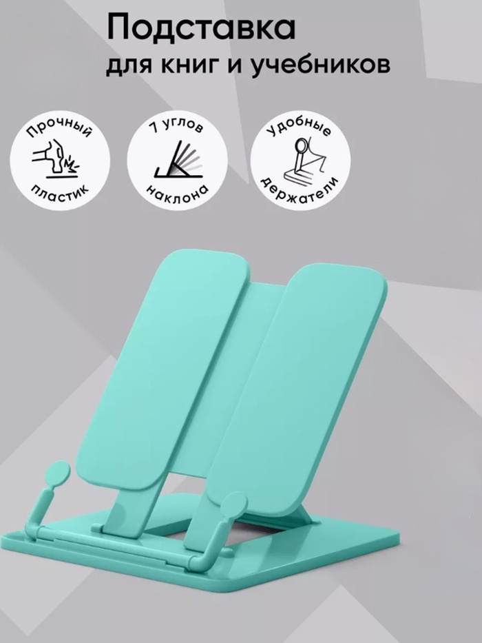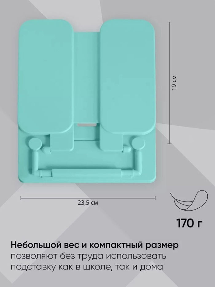 Пластиковая складная подставка с фиксатором. Семь углов наклона для расположения книги, что положительно влияет на осанку и зрение ребенка. Наличие держателей для надёжной фиксации страниц и может использоваться как закладка, а также двух по краям для пишущих принадлежностей. Ширина подставки — 235 мм, высота спинки — 190 мм.
