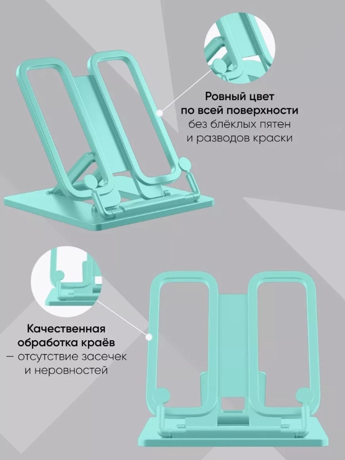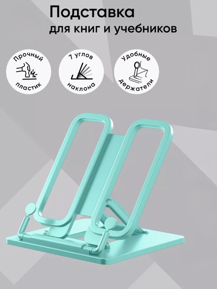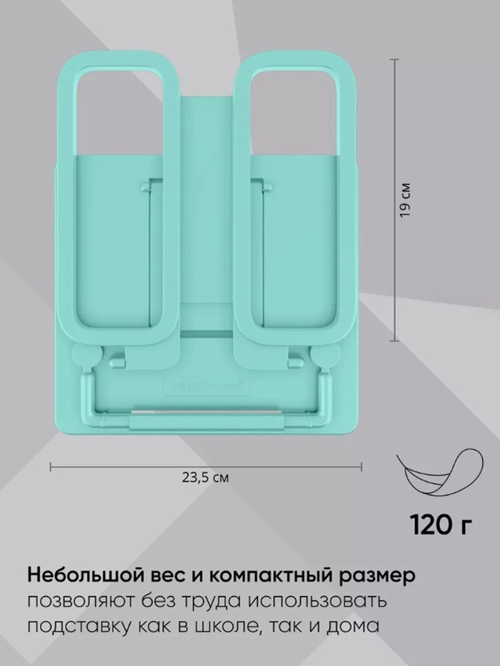 Пластиковая складная подставка с фиксатором. Семь углов наклона для расположения книги, что положительно влияет на осанку и зрение ребенка. Наличие держателей для надёжной фиксации страниц и может использоваться как закладка, а также двух по краям для пишущих принадлежностей. Ширина подставки — 235 мм, высота спинки — 190 мм.