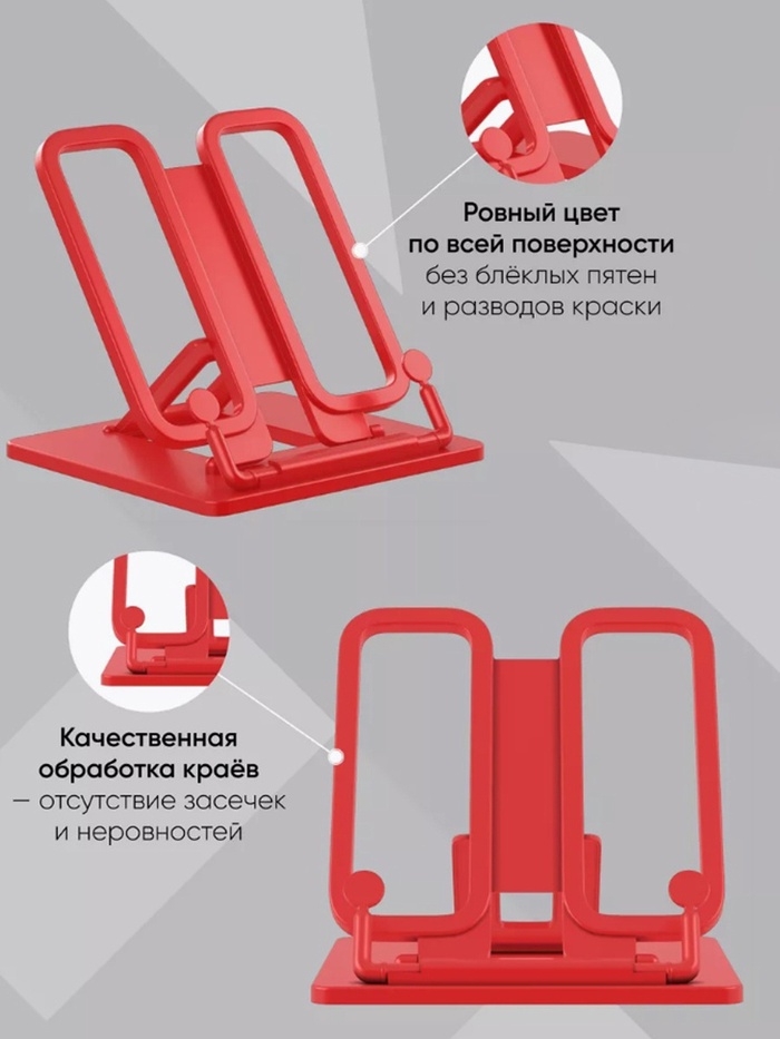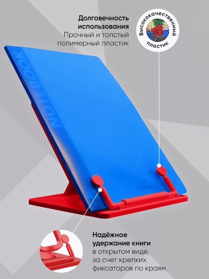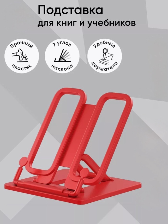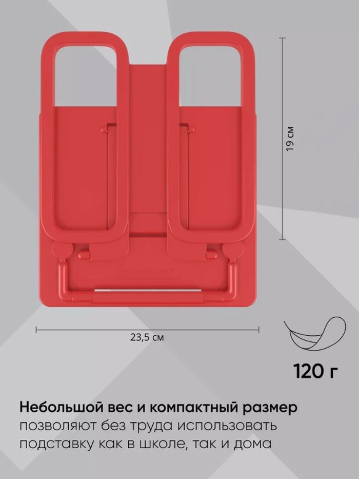Пластиковая складная подставка с фиксатором. Семь углов наклона для расположения книги, что положительно влияет на осанку и зрение ребенка. Наличие держателей для надёжной фиксации страниц и может использоваться как закладка, а также двух по краям для пишущих принадлежностей. Ширина подставки — 235 мм, высота спинки — 190 мм.