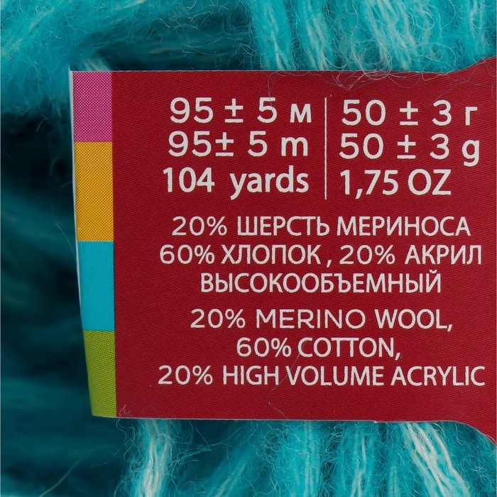 Пряжа для вязания спицами, крючком «Троицкая. Фиджи», 20% мериносовая шерсть, 60% хлопок, 20% акрил, 95 м/50 г, (583 бирюза)