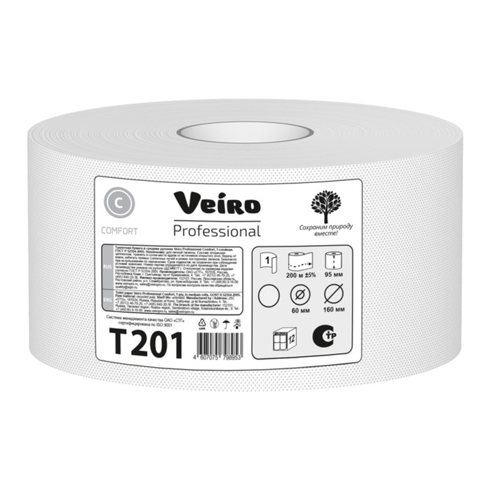 Туалетная бумага для диспенсеров Veiro Professional Comfort T201 в средних рулонах, 1 слой, 200 метров