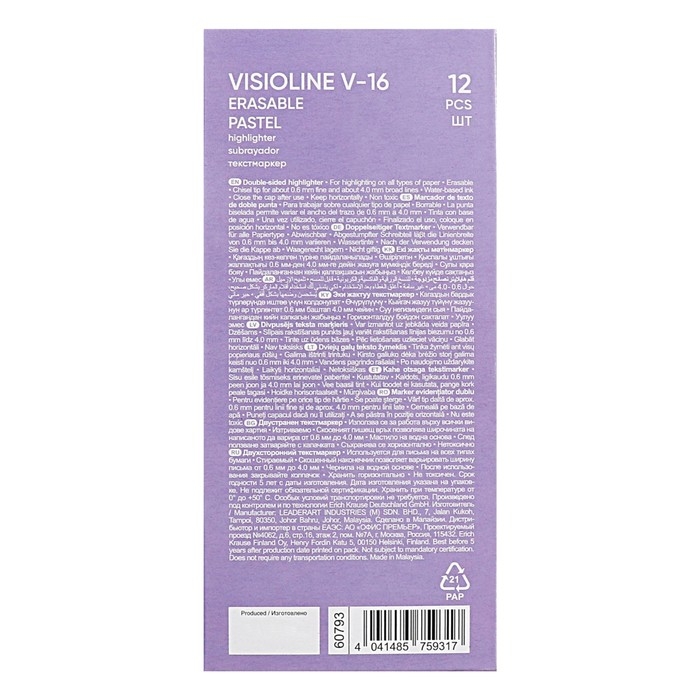 Двухсторонний текстмаркер круглой формы с чернилами пастельных оттенков оснащён скошенным наконечником с одной стороны и стирающим наконечником с другой стороны. Предназначен для работы на всех типах бумаги, в том числе на бумаге для факсов и копировальных машин. Стирающий наконечник позволяет убирать выделение текста без повреждения поверхности бумаги. Пишущий узел скошенной формы позволяет варьировать ширину письма. Широкая часть наконечника 4.0 мм удобна для выделения текста, а тонкая 0.6 мм – для подчёркивания. Цвет корпуса соответствует цвету чернил. Чернила на водной основе быстро высыхают после нанесения и не оставляют следов на обратной стороне бумаги за счёт тонкого и равномерного нанесения. Срок годности 5 лет.