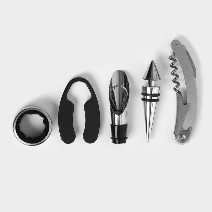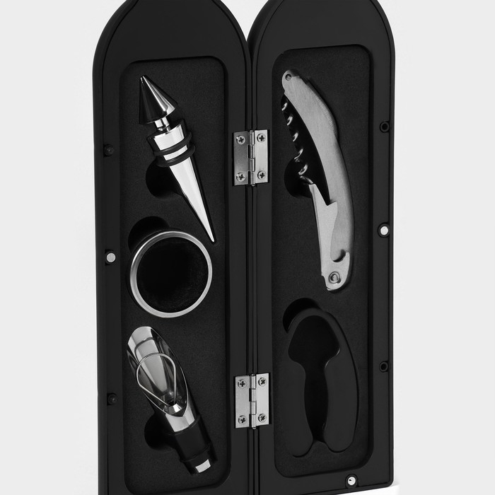 Набор для вина в кейсе Доляна «Бутылка», 5 предметов: пробка, кольцо, каплеуловитель, штопор, нож для срезания фольги