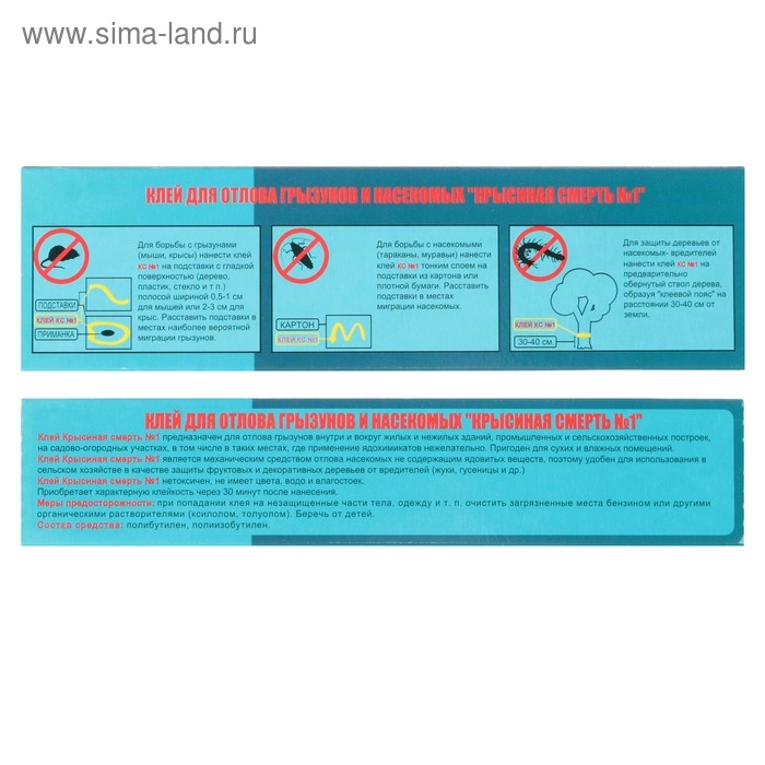Нетоксичное клейкое средство от грызунов Клей "КРЫСИНАЯ СМЕРТЬ №1" предназначено для отлова грызунов внутри и вокруг жилых и нежилых помещений, промышленных и сельскохозяйственных построек, на садово-огородных участках, а также там, где применение ядохимикатов нежелательно. Пригоден для использования в сухих и влажных помещениях. Клей "КРЫСИНАЯ СМЕРТЬ №1"является механическим средством отлова грызунов и насекомых. Не содержит ядовитых веществ, поэтому удобен для использования в сельском и домашнем хозяйстве.