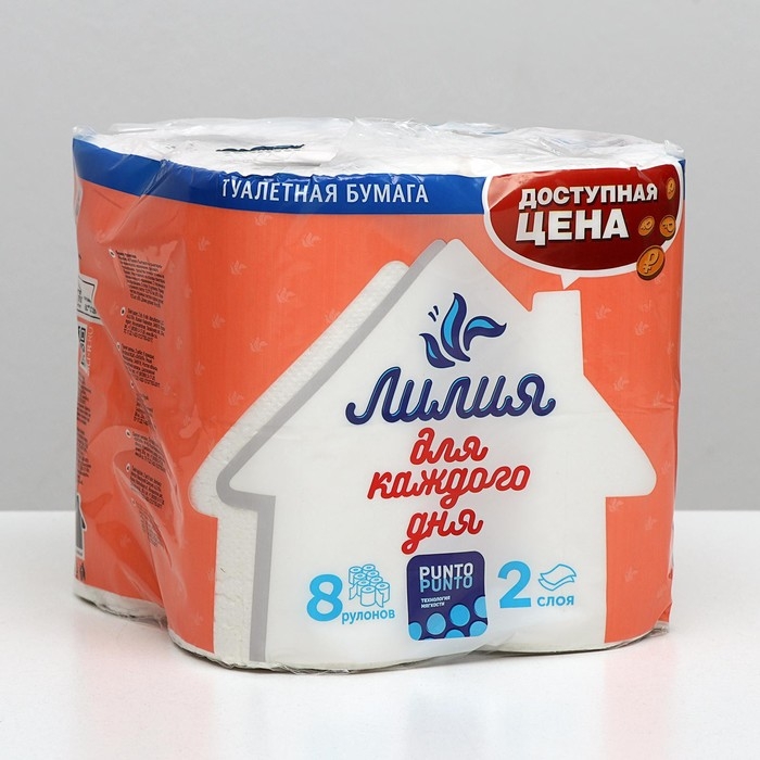 Туалетная бумага «Лилия», 2 слоя, 8 рулонов, белый цвет