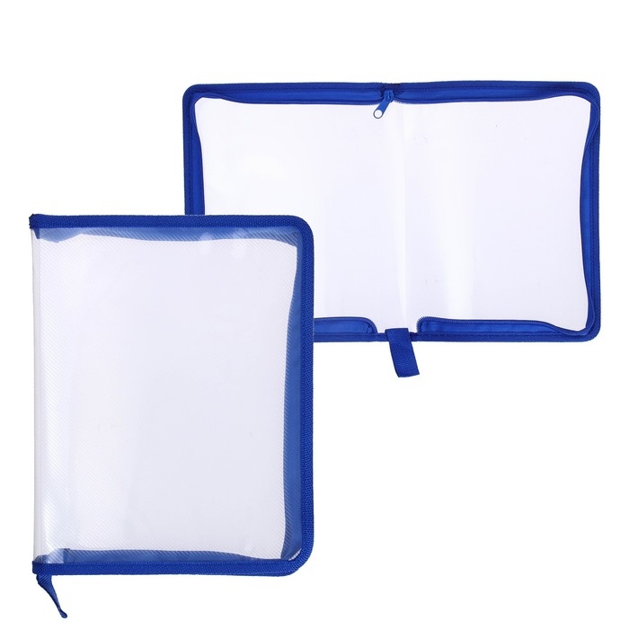 Папка на молнии с 3-х сторон А5, 450мкм, прозрачная, с синим кантом