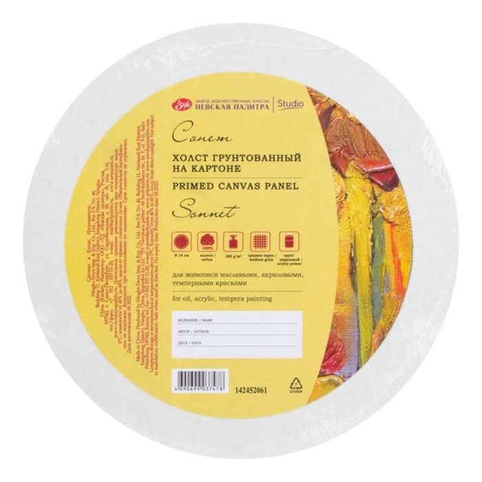 Холст на картоне хлопок 100%, круглый D-18 см, 3 мм, ЗХК "Сонет", акриловый грунт, среднее зерно, 142452061