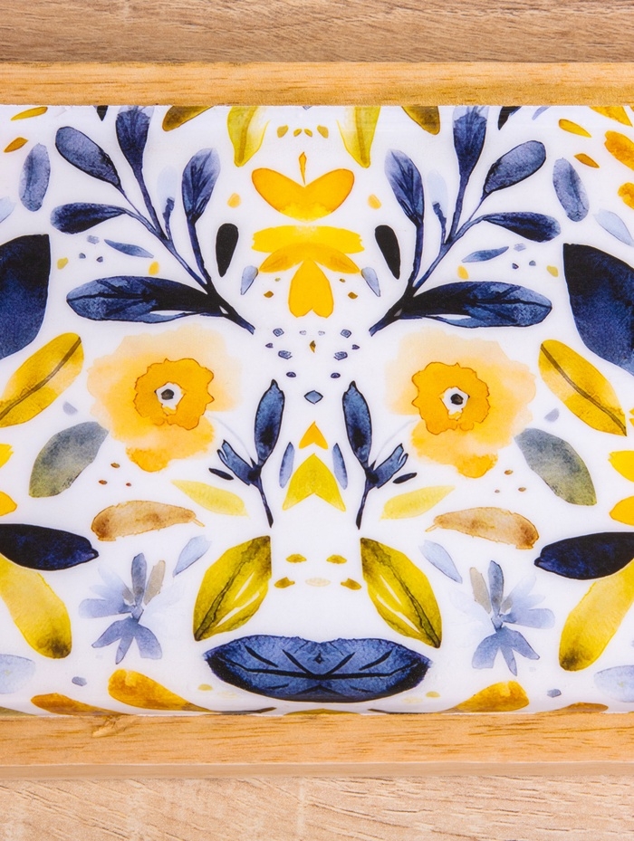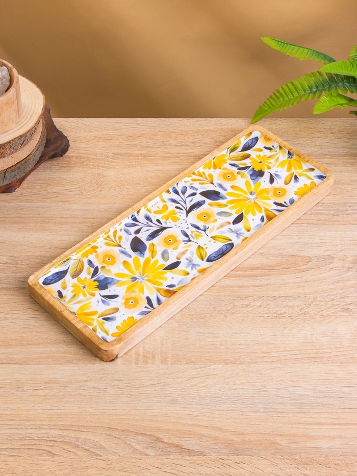 Блюдо прямоугольное "Желтые и синие цветы" дерево манго 41х15 см