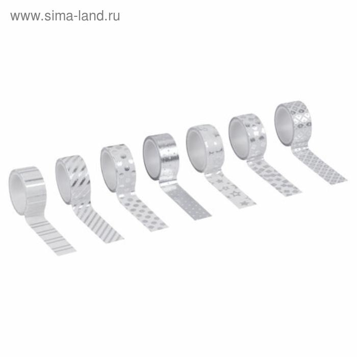 Клейкие WASHI-ленты для декора с фольгой СЕРЕБРИСТЫЕ,15 мм х 3 м (набор 7 шт) рисовая бумага