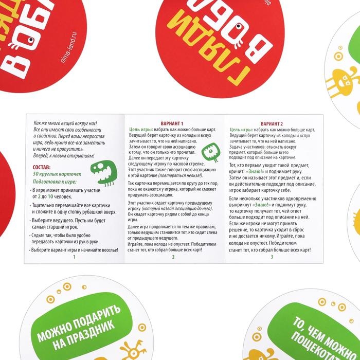 В набор входит 50 карточек с описаниями того или иного предмета. Нужно всего лишь посмотреть по сторонам и увидеть то, что обозначено на карточке. Итак, вам предстоит искать вокруг себя что-то хрустящее: вещи, полезные в хозяйстве или имеющие определенные признаки цвета или формы. В правилах есть три варианта игры, все они помогают научиться мыслить творчески, тренировать память и развивать скорость мышления.