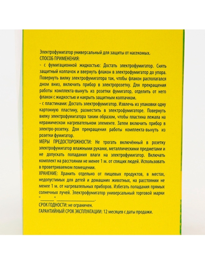 Фумигатор SAFEX – это эффективное устройство для борьбы с комарами и другими насекомыми в помещении. Он работает на основе термического эффекта, который активирует специальную жидкость в пластинах и создает аромат, отпугивающий насекомых. Фумигатор не только защищает от комаров, но и улучшает качество воздуха в помещении, удаляя неприятные запахи.Пластины SAFEX – это ключевой компонент комплекта от комаров. Они содержат специальную жидкость, которая активируется при использовании фумигатора и создает аромат, отпугивающий насекомых. Пластины SAFEX имеют длительный срок службы и легко заменяются.• Не содержит вредных химических веществ• Не оставляет следов на мебели или одеждеКроме того, его легко использовать и подходит для различных помещений, таких как спальня, гостиная или кухня.Если вы хотите наслаждаться летним отдыхом без проблем с комарами и другими насекомыми, то комплект от комаров SAFEX – это именно то, что вам нужно. Он обеспечит защиту от насекомых и улучшит качество воздуха в помещении. Вы можете приобрести комплект от комаров SAFEX уже сегодня и наслаждаться своим временем без беспокойств.Способ применения: достать электрофумигатор. Извлечь из упаковки одну картонную пластину, разместить в электрофумигаторе. Повернуть вилку таким образом, чтобы пластина лежала на керамическом нагревательном элементе. Затем включить прибор в розетку. Состав: ДВ-праллетрин, отдушка, краситель, растворитель.