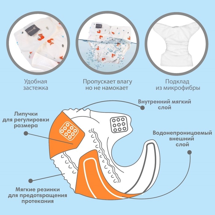 Многоразовый подгузник «Перья», 3-15 кг, цвет белый, Крошка Я