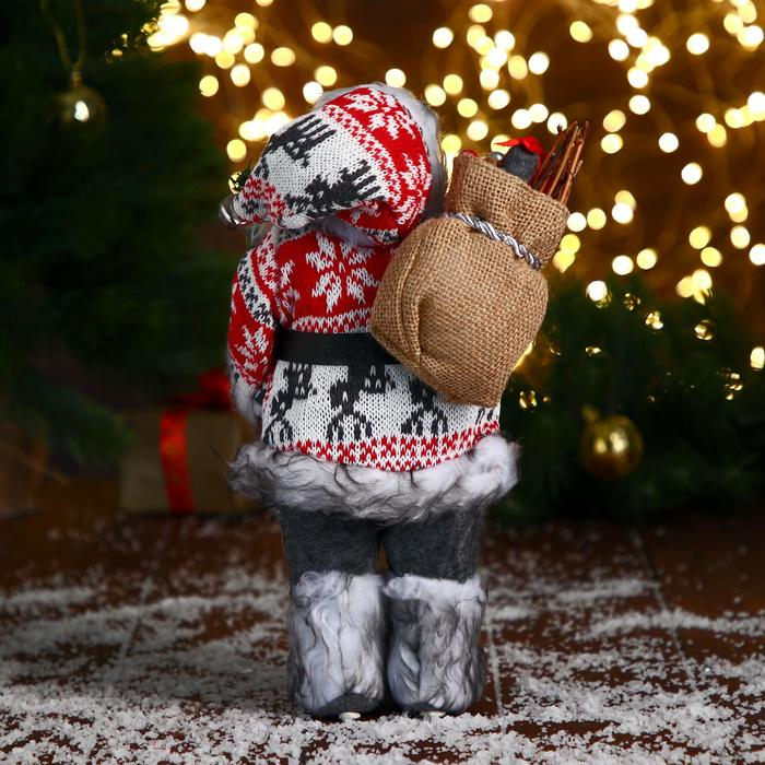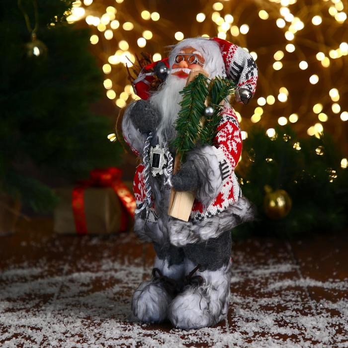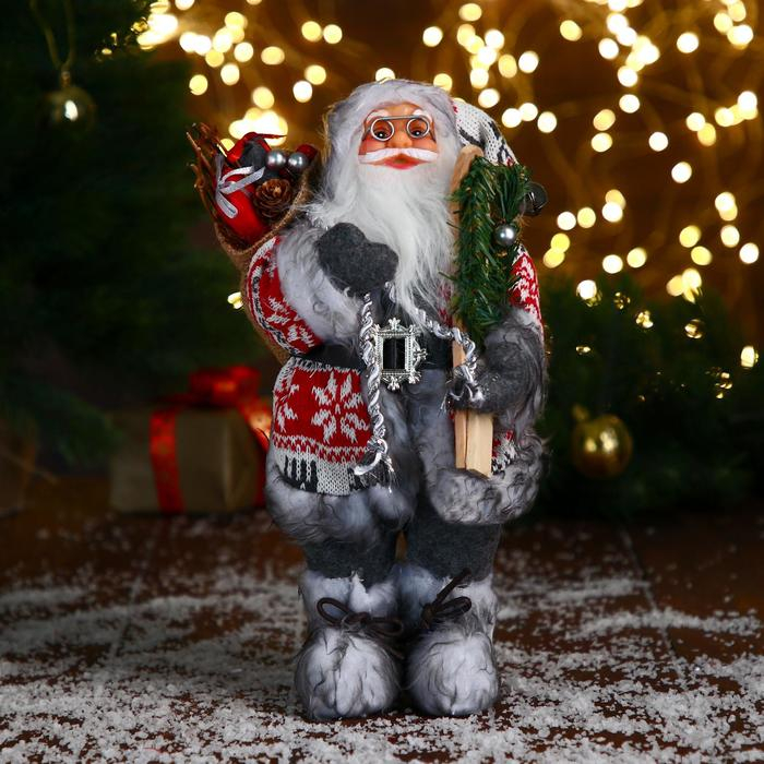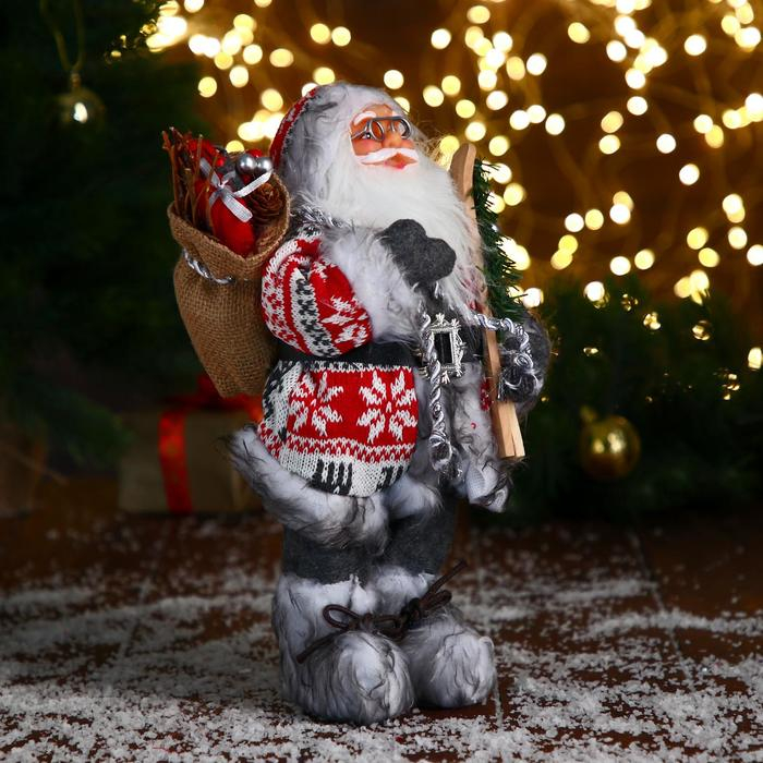 Дед Мороз "В бело-красной шубке с ремешком, с лыжами" 30 см