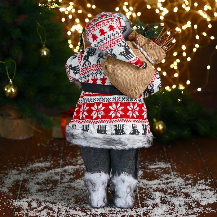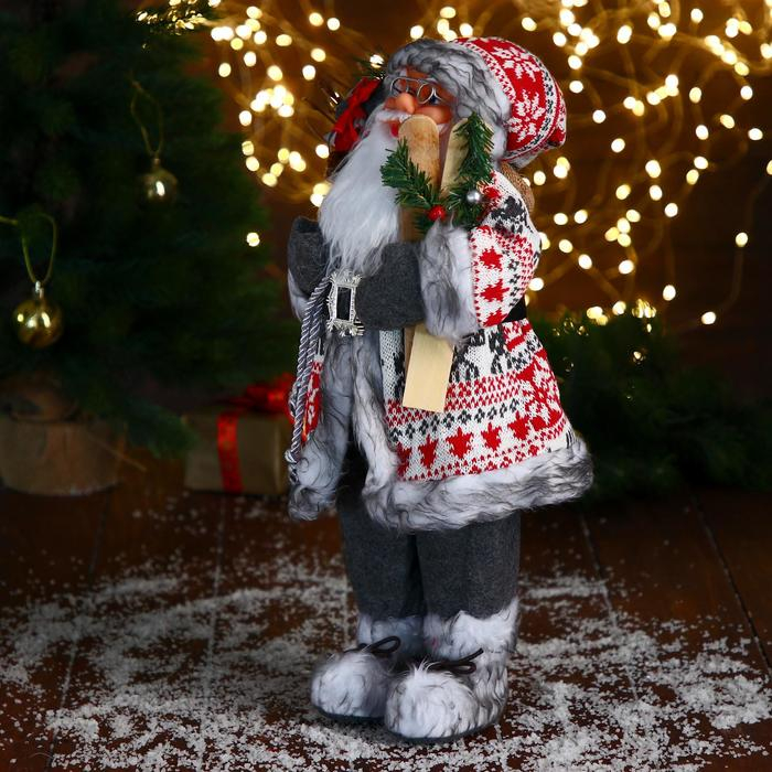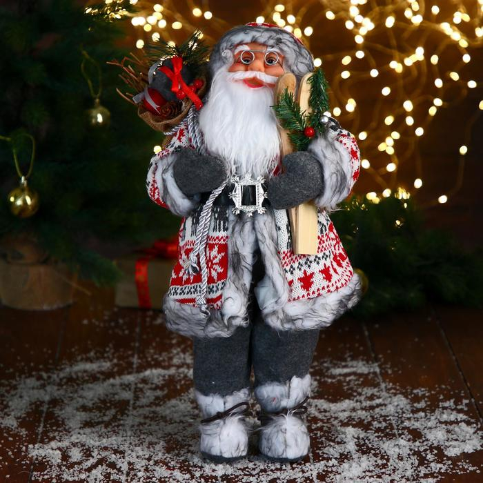 Дед Мороз "В бело-красной шубке с ремешком, с лыжами" 45 см