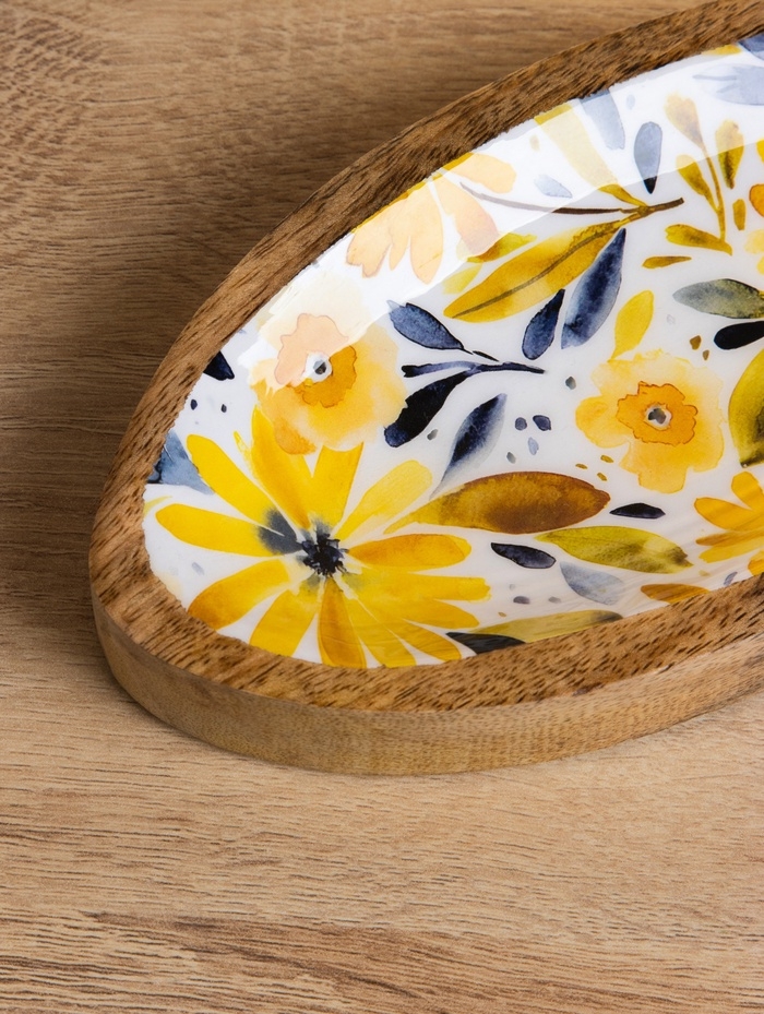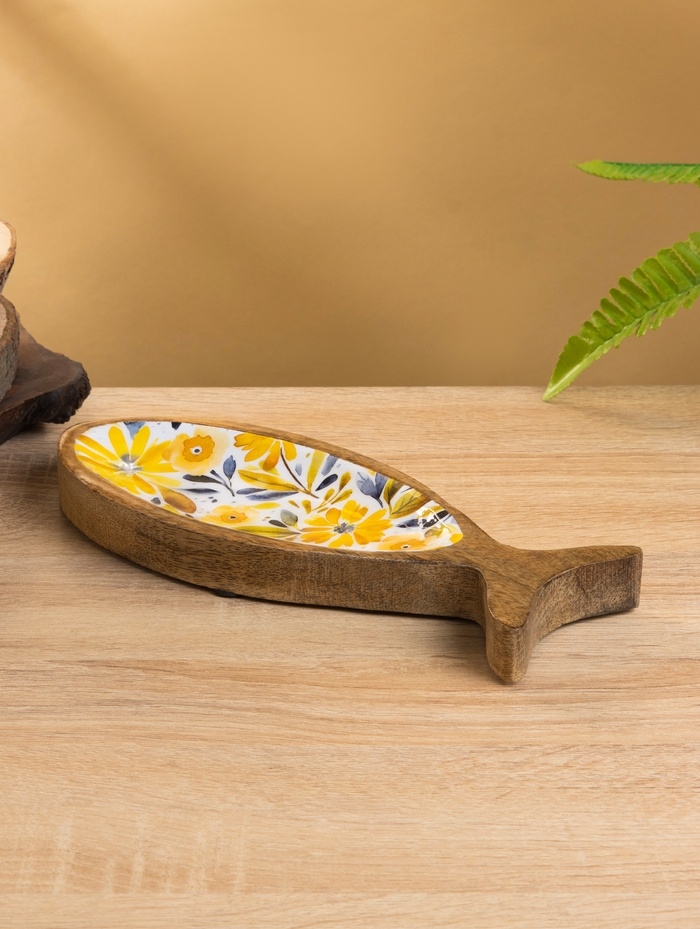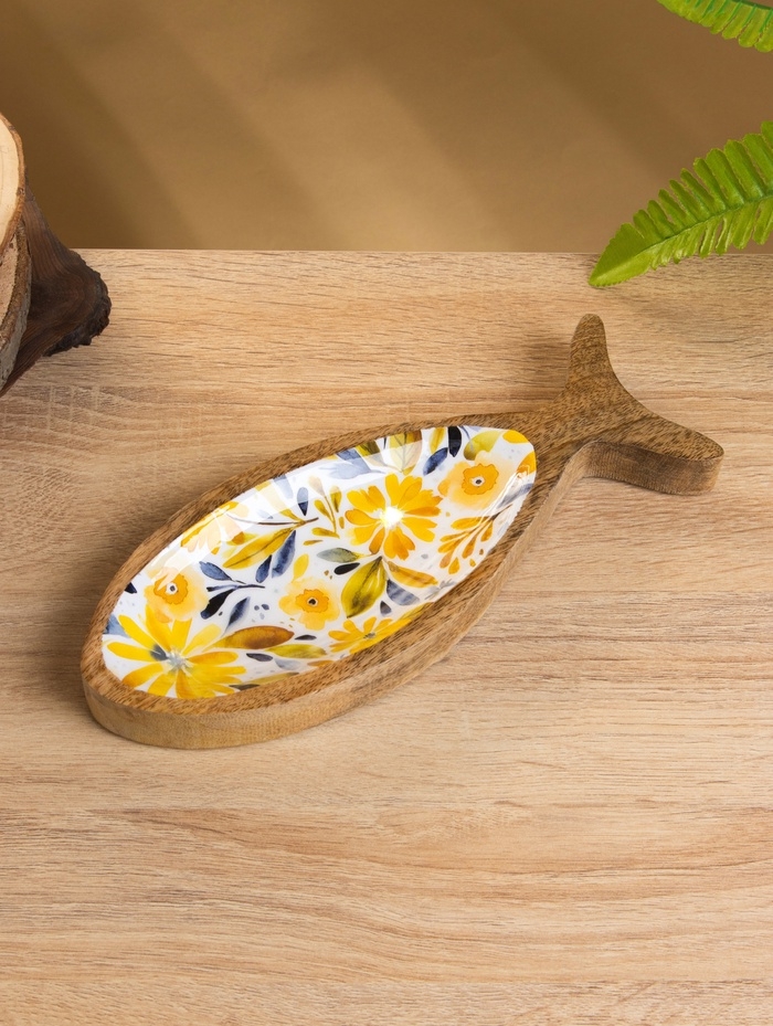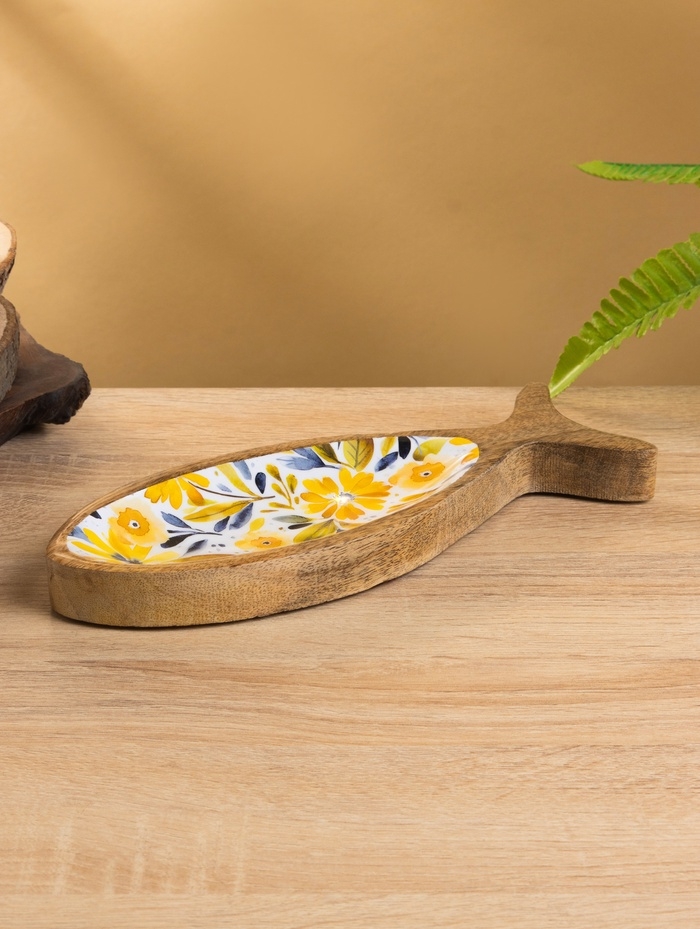 Блюдо в форме рыбки "Желтые и синие цветы" дерево манго 25,5х10х2 см
