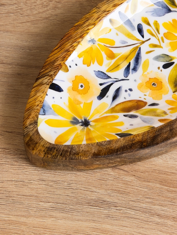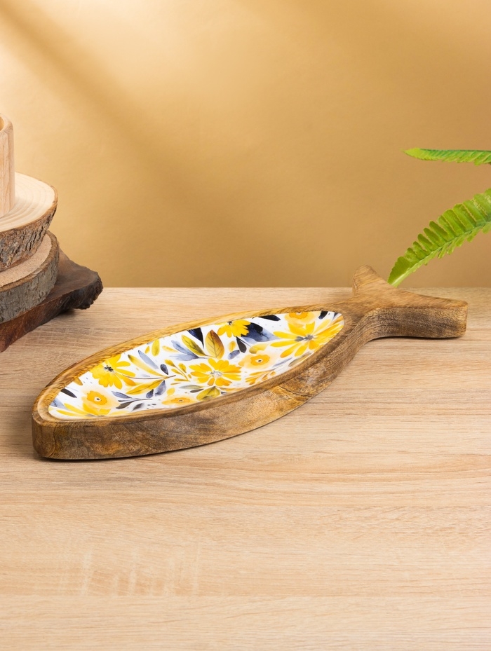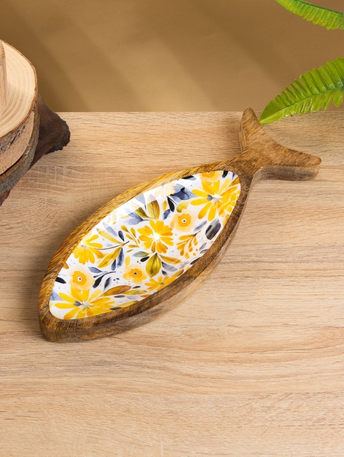 Блюдо в форме рыбки "Желтые и синие цветы" дерево манго 32х11,5х2 см