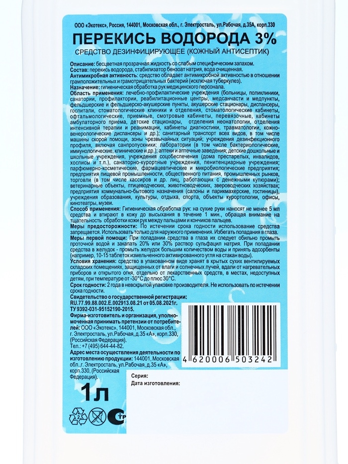 Перекись водорода раствор 3% средство дезинфицирующее, 1 л