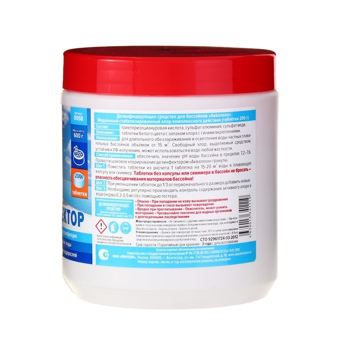 Способ применения: перед применением дезинфицирующего средства необходимо обеспечить значение рН воды бассейна в пределах 7,2-7,6. Необходимое количество таблеток помещают в плавающую капсулу или в скиммер. При интенсивном использовании бассейна дозировку допускается увеличивать в соответствии с показаниями тестера хлора. При этом необходимо постоянно производить контроль и корректировку содержания активного хлора в воде с помощью тестера и осуществлять контроль за содержанием циануровой кислоты в воде бассейна.