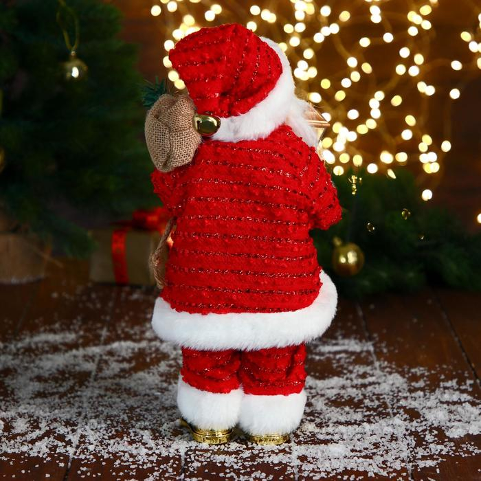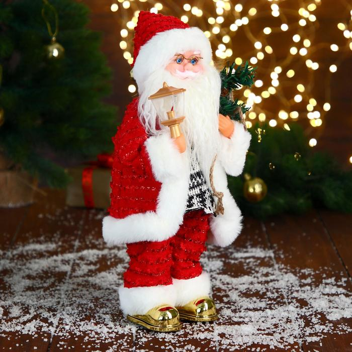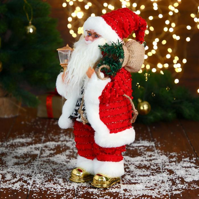 Дед Мороз "В свитере и блестящей шубке с белым мехом" двигается, фонарь светится, 15х35 см