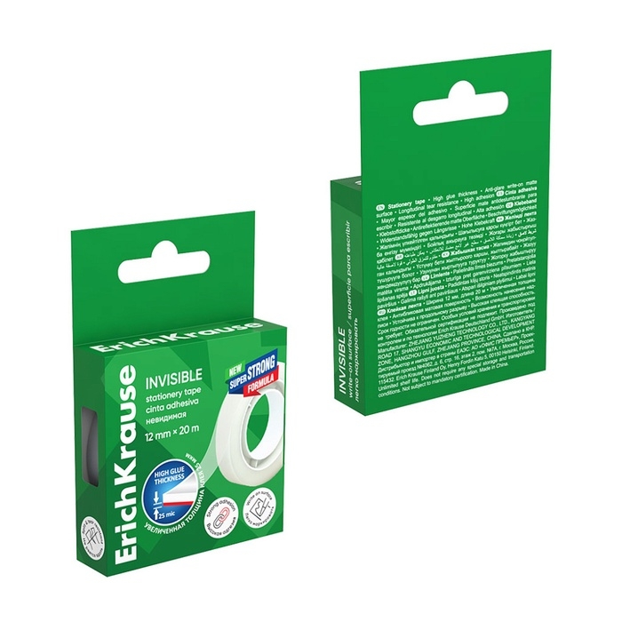 Клейкая лента канцелярская, 12 мм х 20 метра, ErichKrause Invisible, матовая, незаметная, в коробке, с европодвесом