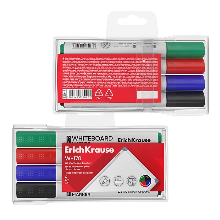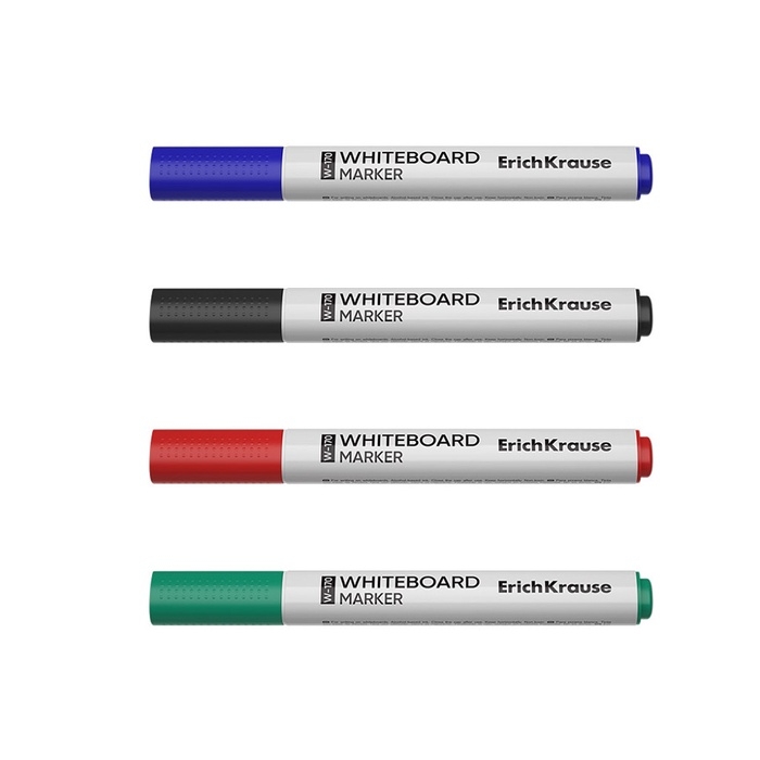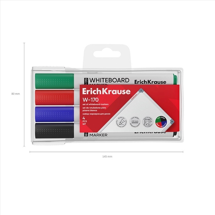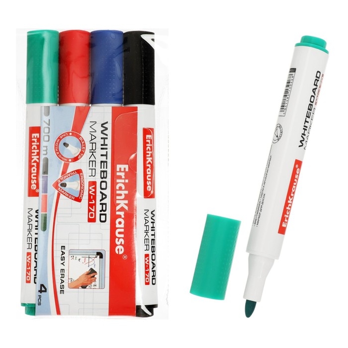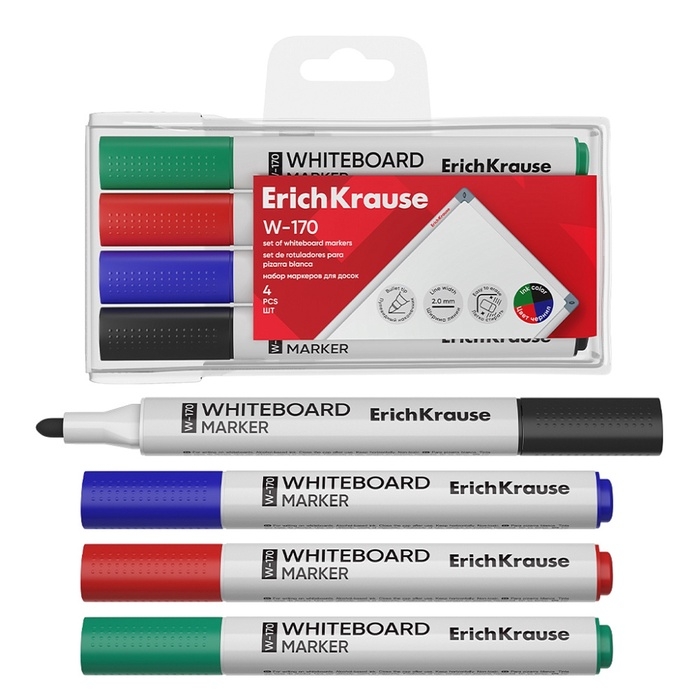 Набор маркеров для досок ErichKrause W-170, 4 штуки, 2.0 мм, чернила на спиртовой основе, чёрный, синий, красный, зелёный