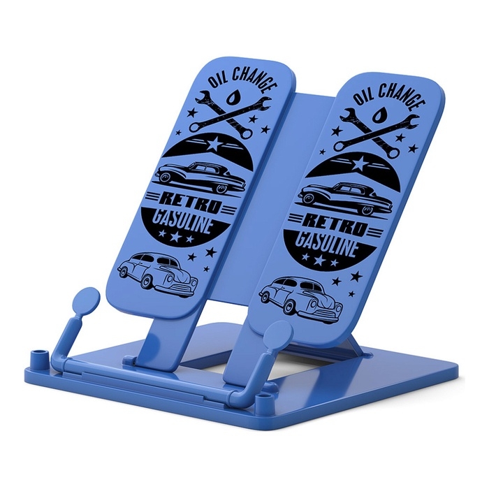 Складная подставка с фиксатором для книг. Рисунок нанесен тампопечатью. Позволяет расположить книгу под удобным углом наклона (7 углов). Держатель, расположенный в нижней части, надежно фиксирует страницы. Ширина подставки — 235 мм, высота спинки — 190 мм.