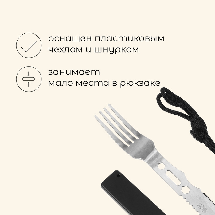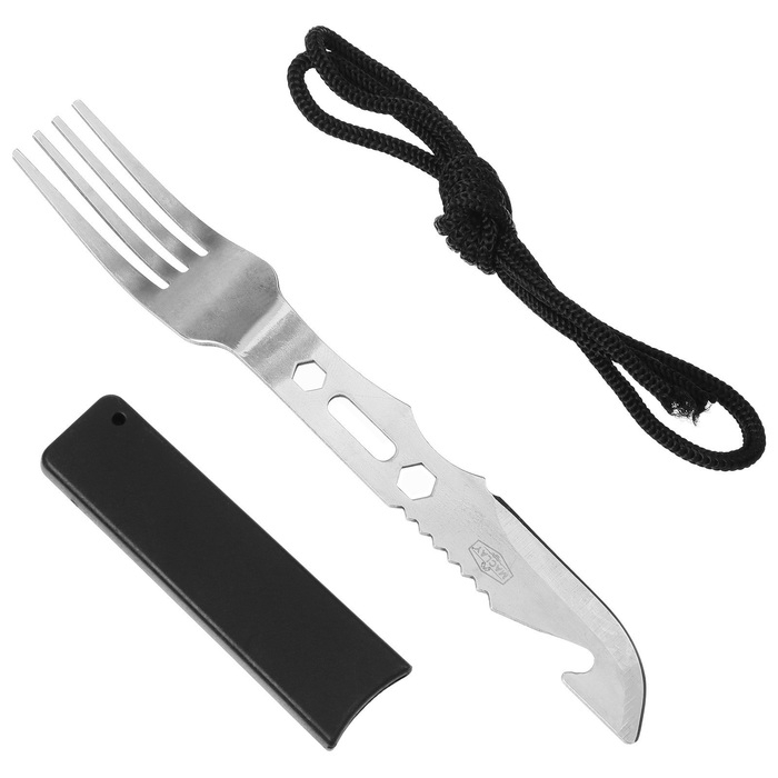 Вилка-нож — необходимый аксессуар для туристических походов. Модель оснащена пластиковым чехлом. Изделие весит немного и занимает мало места в рюкзаке.