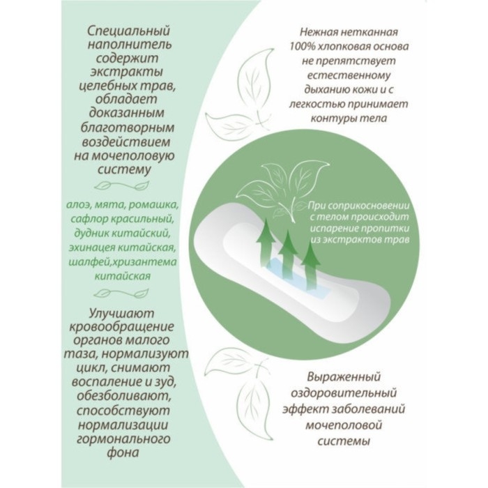 Прокладки разработаны с учётом анатомических особенностей женщин, комфортны в использовании благодаря своей нежной хлопковой основе и наполнителю из экстрактов 24 китайских трав. Оказывают антисептическое и антибактериальное действие на слизистую гениталий. Данные изделия широко используются в комплексной терапии при лечении многих гинекологических и венерических заболеваний.