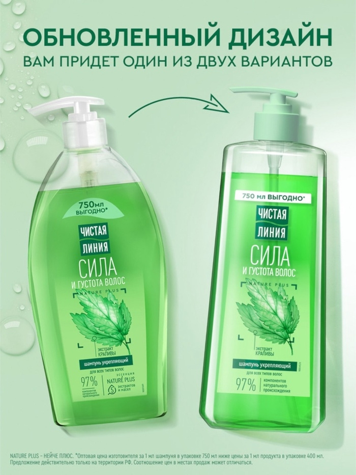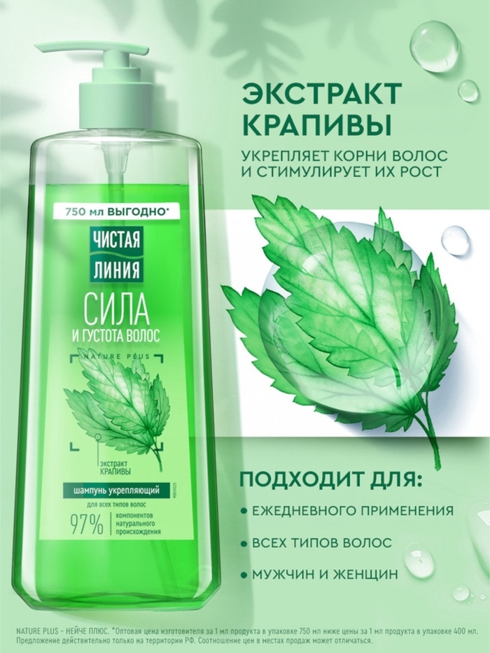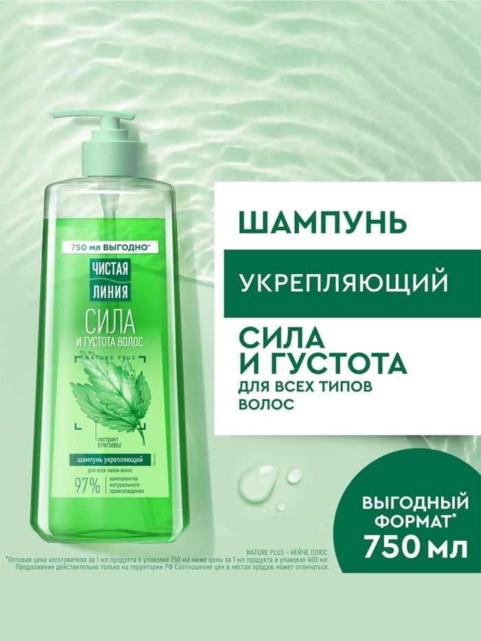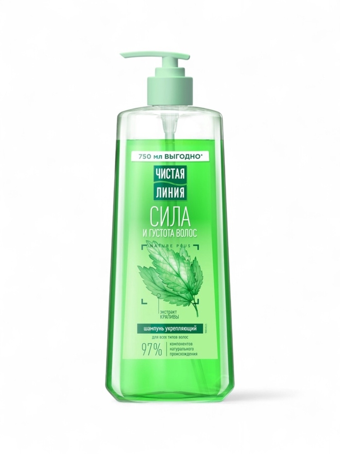 Шампунь Чистая Линия "Сила и Густота" с экстрактом лекарственной крапивы бережно очищает кожу головы, стимулирует рост и укрепляет корни, делая волосы заметно гуще и сильнее.