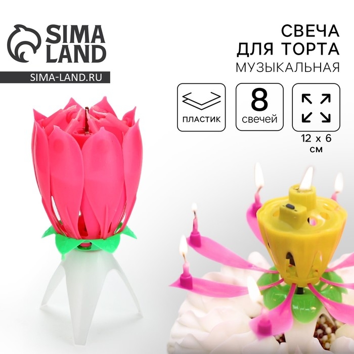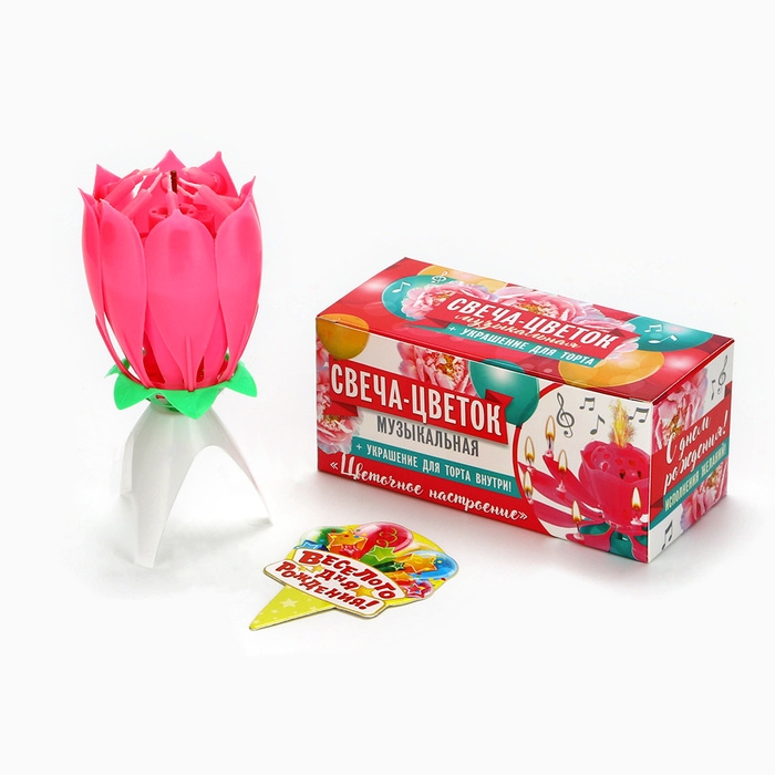Больше всех именинный торт любят дети: ждут с нетерпением дня рождения, чтобы загадать заветное желание, задуть свечи и ожидать его исполнения. Подарите ребенку незабываемый вечер, украсьте торт к его именинам необычным музыкальным цветком.Используя специальную палочку (входит в комплект), зажгите свечу-бенгальский огонь. Пока горит бенгальская свеча - бутон цветка раскрывает свои лепестки - на каждом из которых зажигается маленькая свечка - цветок начинает играть музыку "с днем рожденья" (при этом цветок не крутится).Цветок изготовлен из специальной пищевой пластмассы, фонтан фейерверка представляет собой холодный пиротехнический огонь, как у бенгальских свечей.Принцип действия: при поджигании сгорает изоляция на проволоке, вследствие чего цепь замыкается. Для остановки мелодии разъедините проволоку. Итог:смотрится эффектно, красиво, необычно.