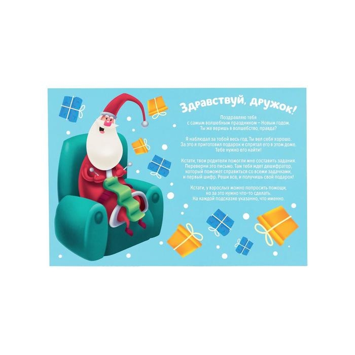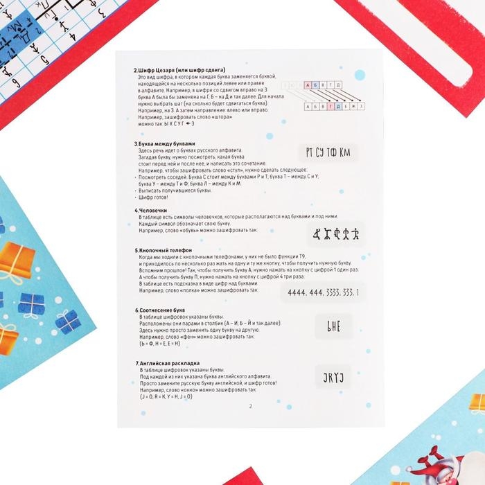 Для начала составьте список из 12 мест квартиры или дома, где будут спрятаны подсказки и сам подарок. Подготовьте презент и спрячьте его в последнем месте. Возьмите письмо и тщательно изучите сторону, где находится таблица с шифром. Вооружитесь ручкой или другим пишущим предметом и составьте код на каждой подсказке. Ответ — место, где лежит следующая. В инструкции описан каждый шифр и приведены примеры заданий. На обороте письма вы должны будете составить первый код. Ответ на него — название места, где лежит вторая подсказка. Когда игрок найдёт её и решит шифр, он узнает место, где лежит третья, и так далее.