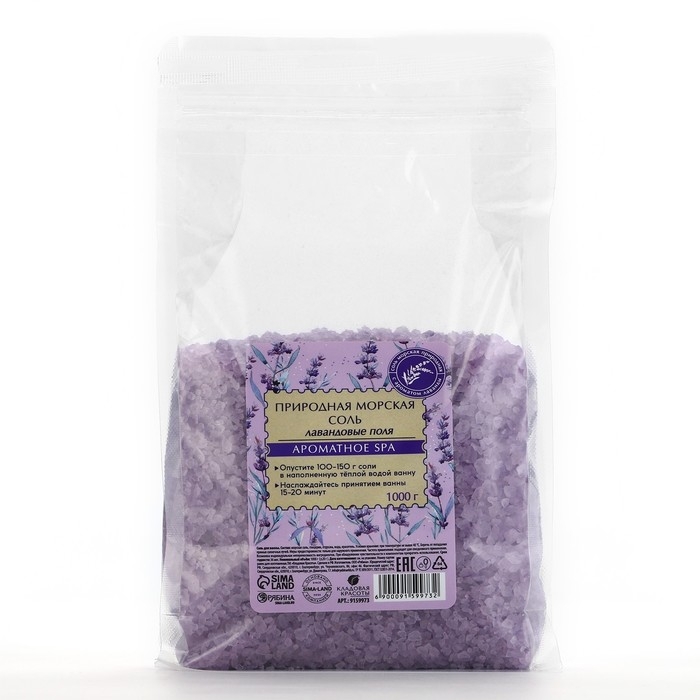 Природная морская соль для ванны, с витаминами А, Е, С, 1 кг (1000 г), аромат лаванды, КЛАДОВАЯ КРАСОТЫ