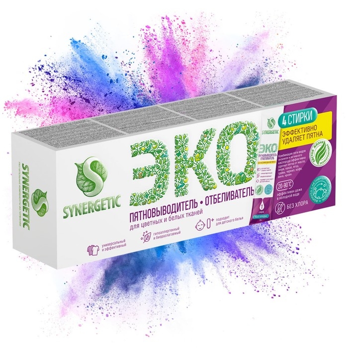 Биоразлагаемый гипоаллергенный пятновыводитель-отбеливатель с активным кислородом SYNERGETIC в стиках - универсальное средство для эффективного удаления загрязнений и трудновыводимых пятен с тканей даже в холодной воде.