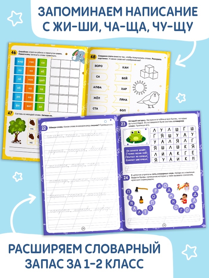 Рабочая тетрадь "Нескучные слова. Правописание словарных слов 1-2 класс", 44 страницы.