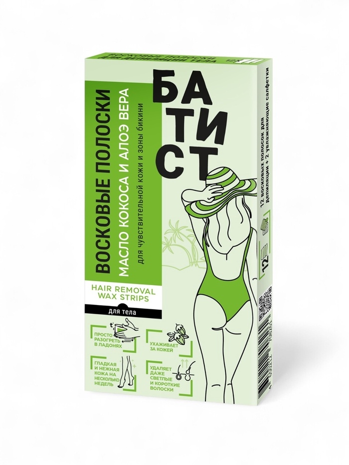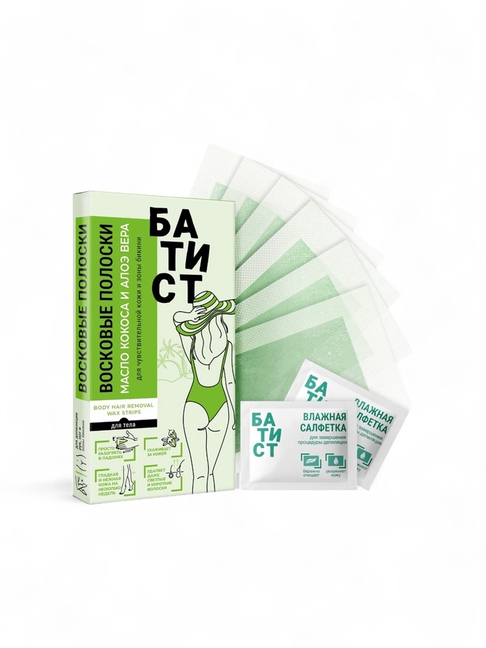 Восковые полоски БАТИСТ для кожи и зоны бикини с маслом кокоса и Алоэ Вера, 12 шт