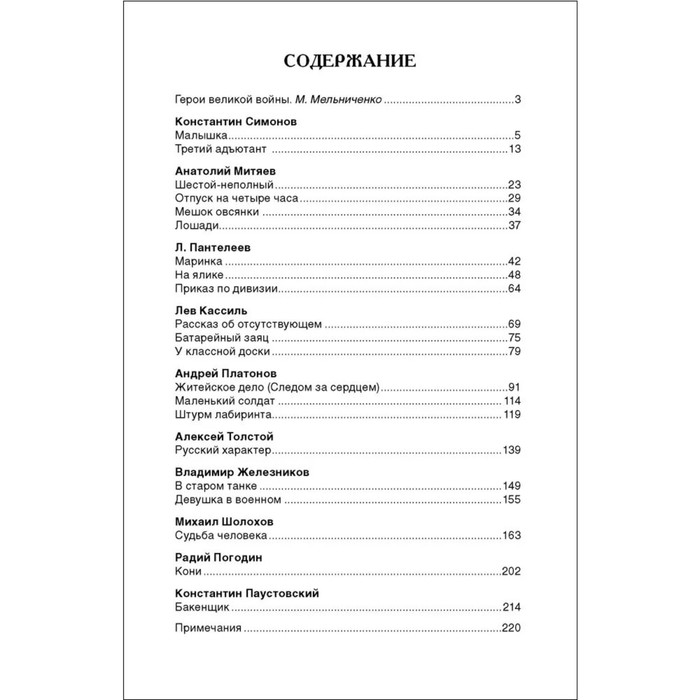 В книгу вошли произведения: А. Митяев «Шестой-неполный», «Отпуск на четыре часа», «Мешок овсянки», «Лошади», Л. Пантелеев «Маринка», «На ялике», «Приказ по дивизии», Л. Кассиль «Рассказ об отсутствующем», «Батарейный заяц», «У классной доски», А. Платонов «Житейское дело», «Маленький солдат», «Штурм лабиринта», А. Н. Толстой «Русский характер», К. Симонов «Малышка», «Третий адъютант», В. Железников «В старом танке», «Девушка в военном», М. Шолохов «Судьба человека», Р. Погодин «Кони», К. Паустовский «Бакинщик». Художник Г. Мацыгин, член международной Федерации художников ЮНЕСКО.