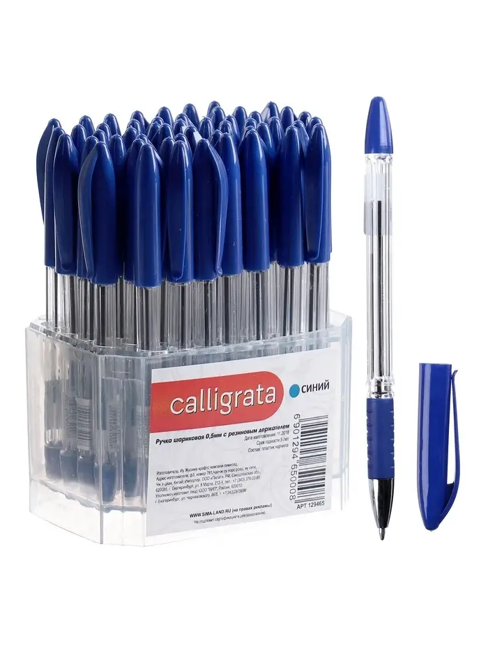 Ручка шариковая Calligrata, синий стержень, узел 0.5 мм, прозрачный корпус, резиновый упор
