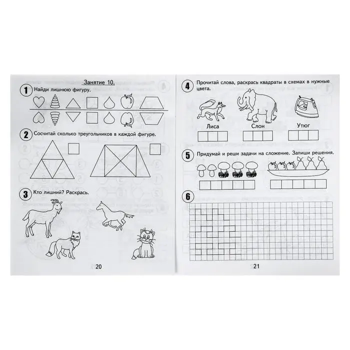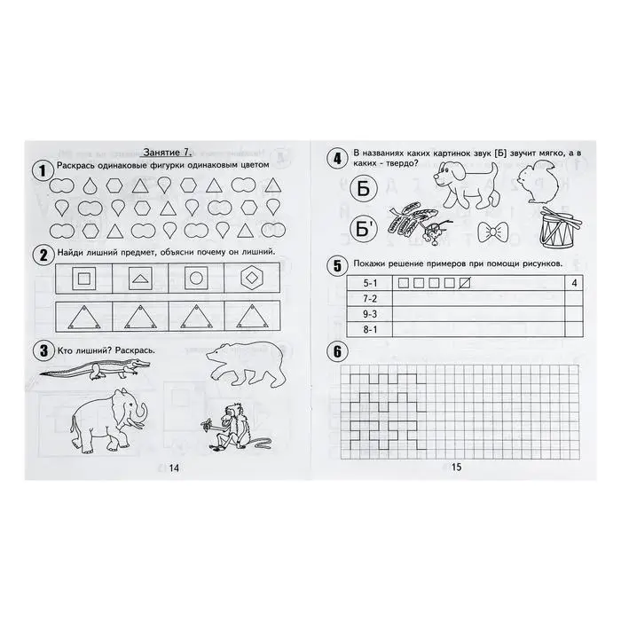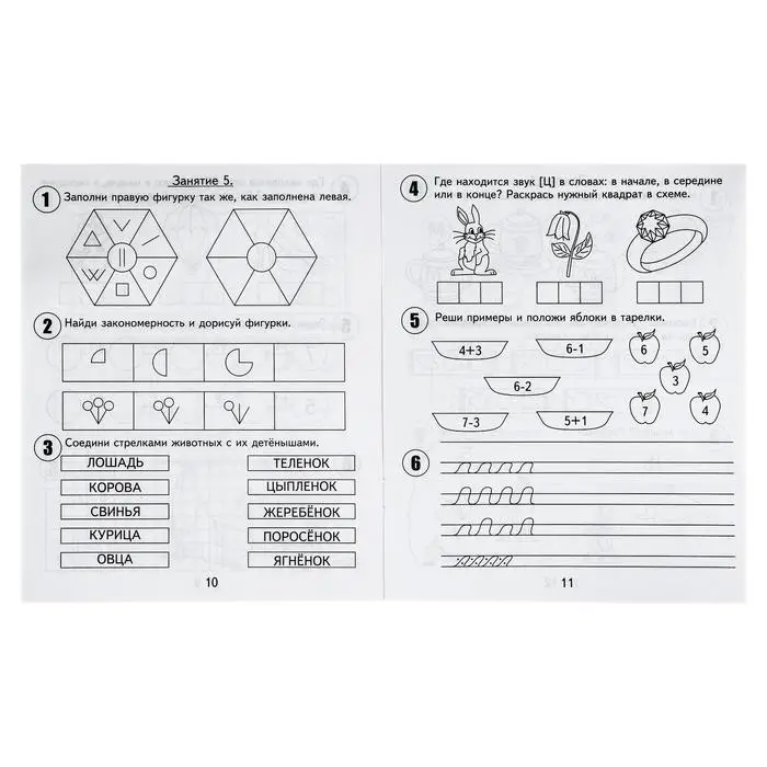 - Каждое занятие состоит из 6 заданий: на развитие внимания, логического мышления, графических навыков и базовых знаний по математике, чтению и окружающему миру.
