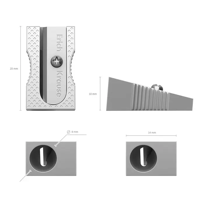 - Имеет отверстие диаметром 8 мм для заточки стандартных чернографитных и цветных карандашей.