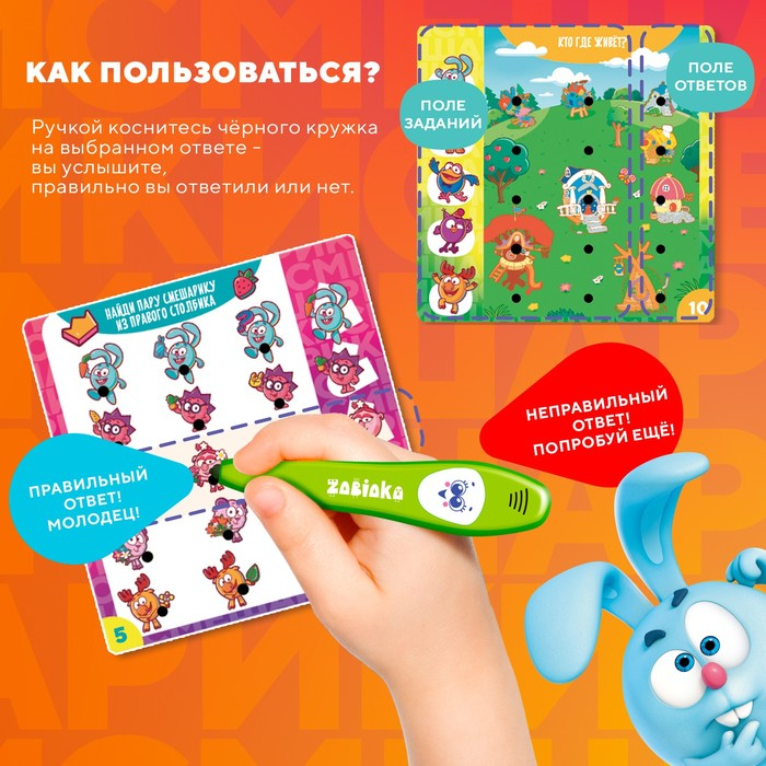 Когда ребёнок коснется ручкой чёрного кружка на выбранном ответе — он услышит, правильно ответил или нет.