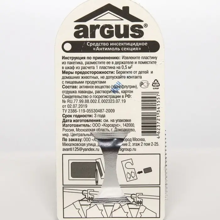 ARGUS Антимоль – инсектицидное средство в виде подвесной пластины с запахом лаванды. Применяется для защиты шерсти, меха и изделий из них от повреждения молью. Состав: активное вещество – трансфлутрин, отдушка лаванды, растворитель, картон. Препарат обладает не только отпугивающим, но и уничтожающими свойствами – убивает моль и ее личинок. Крючок удобен в применении и без особых усилий защитит вещи от моли на 4 месяца.• Средство хранить в плотной закрытой таре, вдали от огня, нагревательных приборов и воздействия прямых солнечных лучей, отдельно от пищевых продуктов, питьевой воды, фуража и лекарственных средств, в местах, недоступных для детей и домашних животных. Состав: вопартрин (0,4 %), отдушка лаванды.Запах: лаванда.Способ применения: извлечь пластину из пакетика, разместите в держателе и повесьте в шкафу из расчёта 1 пластина на 0,5 м2.